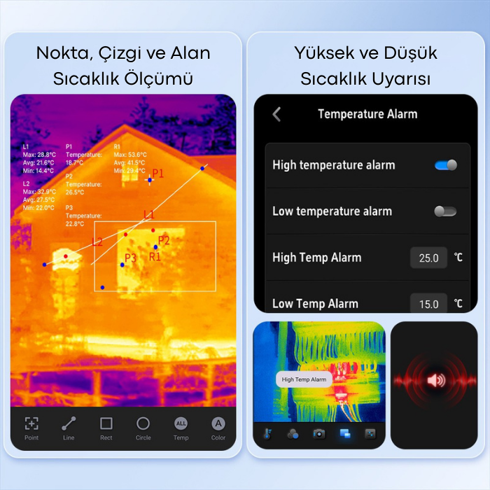 Nokta, çizgi ve alan temelli analiz özellikleri sayesinde maksimum, minimum ve ortalama sıcaklık değerlerini otomatik olarak hesaplar; ayarlanabilir üst ve alt sıcaklık limitlerinde alarm oluşturur ve uyarı sistemi isteğe bağlı olarak aktif ya da pasif hale getirilebilir.