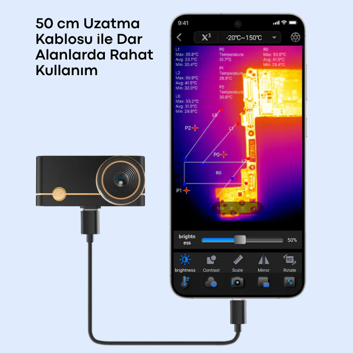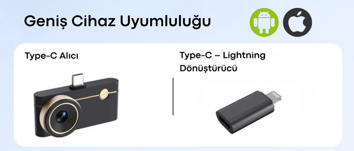 Type-C bağlantı noktası ve Lightning dönüştürücü desteği sayesinde hem iOS hem de Android cihazlarla sorunsuz şekilde uyum sağlar. 50 cm’lik uzatma kablosu ise pano içleri ve dar bölgelerde esnek, güvenli ve kontrollü termal ölçüm yapılmasına olanak tanır.