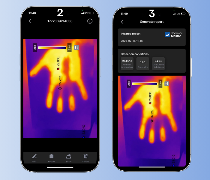 Thermal Master P3, Temp Master uygulaması aracılığıyla alınan termal görüntülere anında erişim ve kapsamlı düzenleme imkânı sağlar. Mobil cihaz üzerinden görüntüler kaydedilip arşivlenebilir, farklı renk paletleri seçilebilir ve ayrıntılı sıcaklık analizleri gerçekleştirilebilir. Uygulama içindeki düzenleme ve raporlama araçları sayesinde ölçüm verileri pratik şekilde organize edilir ve profesyonel rapor çıktıları kolaylıkla oluşturulabilir.